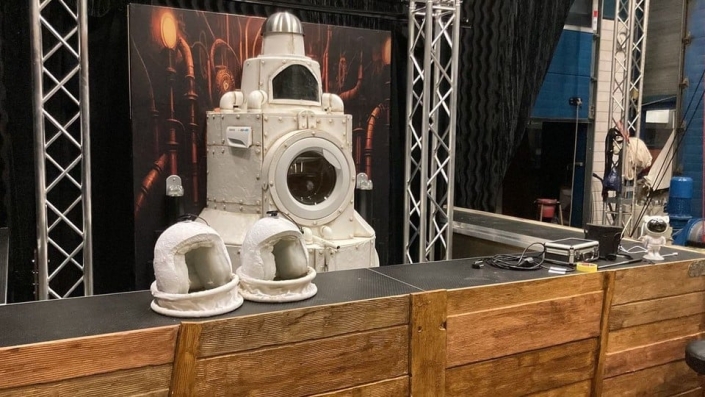 “We werken graag met veel decor en rekwisieten. Het is allemaal speciaal ontworpen op de acts die we doen. De vormgeving is echt een extra speler bij ons, dus ook onze technicus heeft het tijdens de voorstelling druk. Nu hebben we een TV scherm, een draaiend en tegelijk rijdend decor. We werken met blacklight en soundscapes. Alles staat in dienst om een bepaalde grootsheid te suggereren. Van een gat inde grond van 34 meter diep, to het vliegen in de ruimte.”